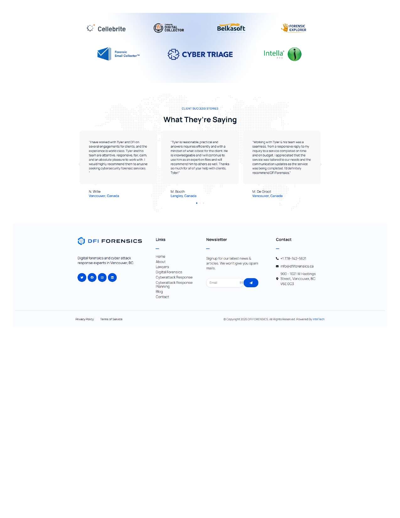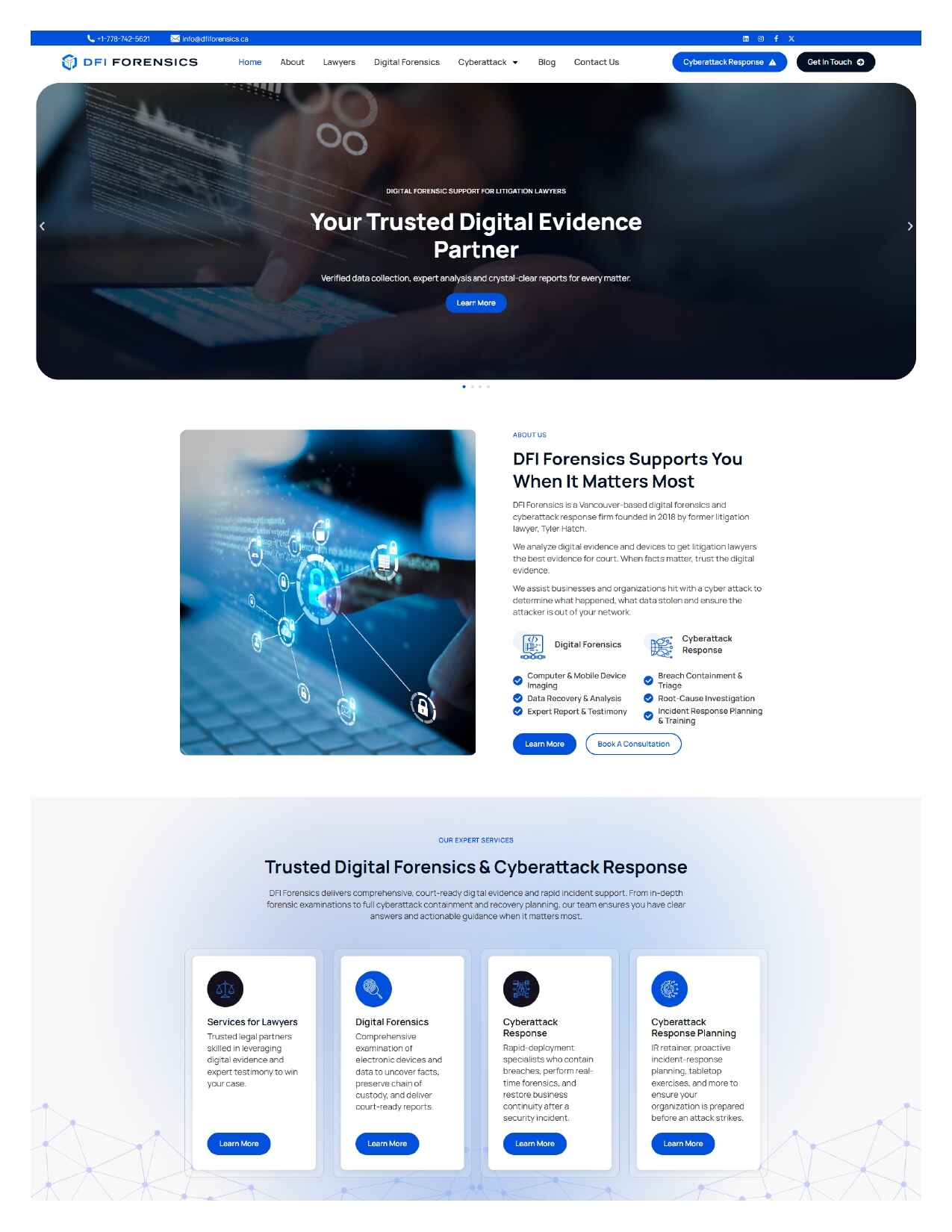 DFI Forensics is a digital forensics and cyber-attack response firm. Designed and developed the entire website end to end UI, layout, page flow, and visual components, ensuring all services are presented clearly, professionally, and aligned with client requirements. The entire platform was built to scale with service offerings, featuring structured pages for digital forensics, mobile/computer analysis, cyber-attack response, eDiscovery and incident recovery.