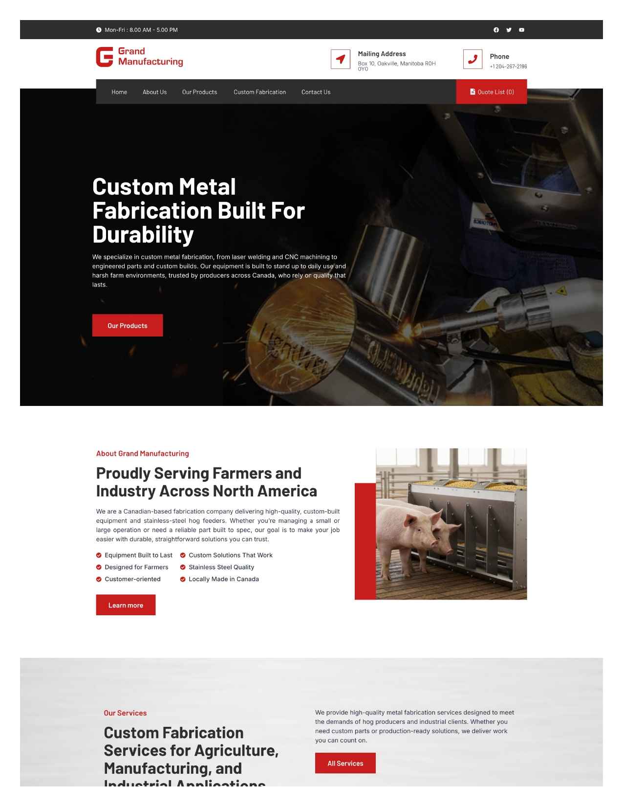 Grand Manufacturing is a metal fabrication and agricultural equipment company based in Oakville Manitoba providing stainless steel feeders custom components and complete fabrication services. I created the required website pages and organized content so products and services are presented clearly for farmers and industrial buyers.